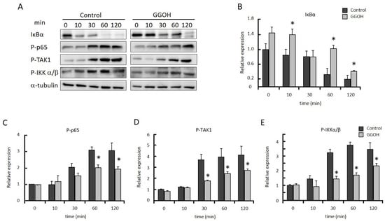 NFκB is a crucial transcriptional regulator for the upregulation of proinflammatory cytokine mRNA. IκB binds to NFκB in the cytoplasm and interferes with the translocation of NFκB into the nucleus. After treatment with LPS, IκB is rapidly degraded, and free NFκB is phosphorylated and translocates to the nucleus, where it stimulates the mRNA expression of its target genes. IκBα protein level was significantly higher in the GGOH-pretreated cells than in the control cells after LPS stimulation (Figure 2A,B). GGOH pretreatment significantly reduced the LPS-induced phosphorylation of NFκB p65 (Figure 2A,C). The upstream kinases, TAK1 and IKK, were sequentially activated by LPS stimulation, leading to IκB degradation and nuclear translocation of NFκB. The phosphorylation of TAK1 and IKK was significantly lower in GGOH-treated cells than in control cells after LPS stimulation (Figure 2A,D,E). These results indicated that GGOH treatment interfered with NFκB activation by LPS and then suppressed inflammatory cytokine expression.