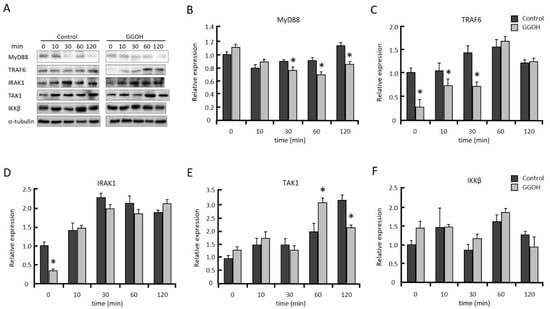 MyD88, IRAK1, and TRAF6 work as upstream regulators in the activation of TAK1. We measured MyD88, IRAK1, and TRAF6, as well as TAK1 and IKKβ protein levels after LPS stimulation. TRAF6 protein level was significantly decreased in the GGOH-treatmed group compared with the control group from 0 to 30 min after LPS stimulation, while TAK1 and IKKβ levels were not significantly different (Figure 3). MyD88 protein level was significantly decreased in the GGOH-treated group from 30 to 120 min. IRAK1 protein level was significantly reduced by GGOH treatment only at the start of LPS stimulation (0 min). These results suggested that GGOH pretreatment decreased IRAK1 and TRAF6 protein levels at the start of LPS stimulation, which resulted in the suppression of LPS-induced inflammation.