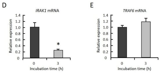 To clarify whether GGOH suppresses the expression levels of IRAK1 and TRAF6 prior to LPS stimulation, THP-1 cells were incubated with GGOH, and the levels of both protein and mRNA were measured. We observed that the protein levels of IRAK1 and TRAF6 were significantly decreased after 1 h of GGOH treatment (Figure 4A–C). The level of IRAK1mRNA was significantly decreased after 3 h of GGOH treatment, while the level of TRAF6 mRNA was not changed (Figure 4D,E). On the other hand, TRAF6 mRNA was significantly decreased after 24 h of GGOH treatment (Figure S1). These results indicated that the decrease in IRAK1 and TRAF6 proteins by GGOH occured in a transcriptionally dependent and independent manner at 3 h of GGOH treatment, respectively.