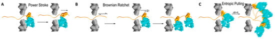 Chaperone proteins were so dubbed because they “prevent inappropriate interactions” [], a designation that aptly captures what was initially believed to be their primary or exclusive function: to prevent non-specific aggregation, but not to disrupt aggregates. However, as understanding of chaperones grew, it was discovered that these proteins could resolubilize protein aggregates [,,], and that an Hsp70 chaperone, together with specific assisting cochaperones in carefully titrated amounts, could even solubilize amyloid fibrils, whose stability had been expected to preclude resolubilization []. The ability of particular Hsp70 chaperone–cochaperone systems to break up aggregates was added to their abilities to disassemble defined protein complexes (e.g., clathrin coats []) or translocate proteins into the ER [] or mitochondria [] as examples of the ability of these systems to act as motors that transduce the chemical energy of ATP to move or physically alter their substrates. Efforts to understand the mechanism of these motors, particularly in the context of protein translocation [,], focused initially on the two models—Brownian ratchet or power-stroke—that have long delimited thought on how molecular motors act. However, it also led to the proposal of a model, dubbed entropic pulling [], that represents a genuinely novel break in the debate between the two more familiar models. Subsequent experimental evidence has supported entropic pulling [], but it’s unclear if this model is well understood in the chaperone community. In this review we describe the three models that have been used to explain Hsp70 motor mechanisms, and expand on the description of the entropic pulling model, using simple examples to clarify the basic physics. Evidence in favor of this model, and inconsistent with the other competing other models, is also discussed. Ideally, this review will enhance understanding and inform new experimental approaches to characterizing how Hsp70s work and coordinate with cochaperones.