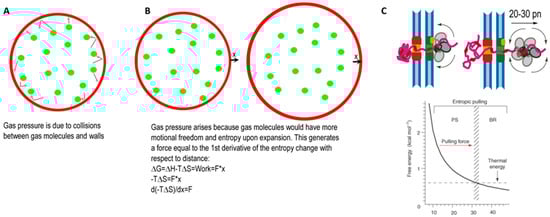 But how, mechanically, does entropic pulling actually generate a directional force large enough to unfold a protein or pull a polypeptide out of an amyloid fibril? It can be easier to understand this by referencing a simpler, analogous system. Consider how we are introduced to the phenomenon of gas pressure, which is explained as being generated by collisions of gas molecules with the walls of the vessel in which they are contained (Figure 2A). This is the molecular-kinetic (trees) description. We could also give a thermodynamic or forest description by noting that expansion of the gas is a molecular process governed by ΔG = ΔH−TΔS. Since (ideally) gas expansion is purely entropy driven, we can reduce this to ΔG = −TΔS. But ΔG is also work, which is also force multiplied by the distance over which the force acts, so we then have: ΔG = −TΔS = work = −F*ΔX, or F = TΔS/ΔX. We can therefore also describe gas pressure as arising because, upon expansion, the gas will gain motional freedom and entropy, and will therefore generate a force equal to the first derivative of the free energy (entropy) change with respect to the distance increment (Figure 2B).