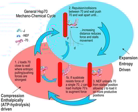 Recent studies of the Hsp70 force generation mechanism, using Hsp70-mediated disassembly of clathrin coats as a tractable system, supported the entropic pulling model, and resulted in the proposal for the general Hsp70 mechanochemical cycle shown in Figure 3 []. In keeping with the use of analogies to enhance understanding, we can describe this cycle as working very much like a compressed gas cooling system. There is an ATP-burning enthalpic compression phase whose function is to load Hsp70s into constrained spaces where the entropic pulling/pushing forces exerted by collisions and repulsion between the flexibly tethered Hsp70s and constraining walls are greatest, and there is an entropically driven expansion phase in which these forces drive the Hsp70s and constraining walls apart.
