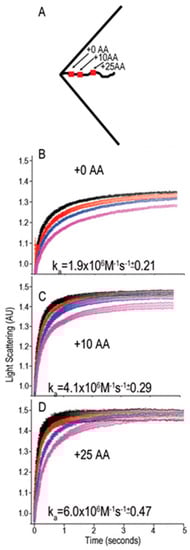 We would expect that protein binding in the constrained spaces into which Hsp70s are recruited during the compression phase of the mechanochemical cycle (Figure 3) will be sterically less favorable than binding in more accessible spaces. Indeed, when antibody binding to a FLAG tag introduced into the clathrin C-terminus was measured, it was found that moving the tag away from the clathrin coat walls by inserting 10 or 25 AA upstream of the tag site progressively increased binding rates by more than 2- and 3-fold, respectively (Figure 5) []. The J cochaperone requirement to interact simultaneously with protein substrate and Hsp70 during Hsp70 loading provides a mechanism to overcome this bias for binding to more accessible sites, rather than spatially constrained ones. Hsp70 NEFs, however, do not need to bind simultaneously to protein substrates and Hsp70 when they act on the latter, and therefore lack such a mechanism. This should bias them to acting upon Hsp70s that are at the end of the expansion phase of the mechanochemical cycle (Figure 3), when they are more accessible. Such biasing may be enhanced for the NEFs most effective at supporting disaggregation—the Hsp110s—which are usually larger than J cochaperones and display long disordered loops or termini that add disproportionately to their hydrodynamic radii [] and would inhibit close approach of these proteins to constrained spaces. Gao et al., for example, observed that the DNAJB1 J cochaperone bound closely to the surface of synuclein fibrils, allowing detection of a FRET signal between the synuclein and DNA JB1, which covered the fibril surface densely with particles 2–3 nm in size. In contrast, the APG-2 (Human Hsp110) NEF bound much more sparsely as particles 5–10 nm in size that were at greater distance from the fibril surface []. Differences in hydrodynamic radii and in how J cochaperones and NEFs interact with Hsp70s may, in whole or in part, provide the mechanisms that bias J cochaperone loading of Hsp70s into constrained spaces during the compression phase of the mechanochemical cycle, and NEF unloading of Hsp70s from more accessible spaces towards the end of the expansion phase.