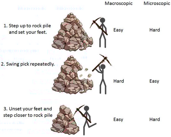 Different steps in breaking up an aggregate are differentially difficult at the macroscopic and microscopic levels. At the macroscopic level stepping up to the aggregate and setting one’s feet (step 1) is easy, as is unsetting one’s feet and moving closer to the pile (step 3) once our efforts have broken up part of it, but the intermediate step of whacking at the pile is energy consuming and hard. At the microscopic level the reverse is true: fixing a protein near an aggregate (step 1) is hard and requires stabilizing interactions, which necessarily means that step 3, in which these interactions are disrupted, will also be hard and energy consuming. Step 2, however, is easy and need not consume ATP since collisions and fluctuations provide the motive forces that drive the pick against the aggregate.