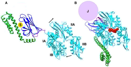 ATP energy is used to stabilize an Hsp70 conformation that disrupts interactions with NEFs and protein substrates, and forms the binding site for the J cochaperone. (A) Structure of bacterial Hsp70 (DnaK; 1KHO.pdb []) in the ADP state with the nucleotide binding domain (NBD) in cyan, the interdomain linker in magenta, and the β-sheet and helical subdomains of the substrate binding domain (SBD) shown in blue and green, respectively. This is the intrinsically more stable conformation which is also assumed in the absence of nucleotide [], and which traps substrate proteins (“S”) as extended peptides between the helical and β-sheet parts of the SBD. (B) Structure of Hsp70 in the ATP conformation (1BQ9.pbd []). ATP binding induces closure of the NBD by hinging of lobe IIB towards lobe IB, and lobe IIA away from IA, as indicated by arrows in panel A. Closure of the NBD disrupts interactions with NEFs, which bind and stabilize open conformations of the NBD. Widening of the space between lobes IA and IIA allows the interdomain linker to bind in this space and extend the lobe IIA β-sheet. These changes create binding sites for the J cochaperone (which binds in the space defined by sphere labeled “J”) and for the β-sheet and helical parts of the SBD, resulting in opening of the latter and release of bound substrates.