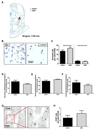 During the development of brain infarction, external signals from the cerebral microenvironment, in concert with intrinsic signaling pathways, determine whether neurons will die. In this context, inflammatory processes play a crucial role, namely the invasion of immune cells due to ischemia and beginning necrosis of cerebral tissue. Depending on the cell type and its phenotype, the immune cells may have preferentially more anti-inflammatory or pro-inflammatory effects []. Therefore, we investigated whether MLR-HFS alters the composition of the cellular infiltrates around the photothrombotic lesion. For this purpose, we generated the cytospins of brain tissue dissected 0–4 mm anterior from the bregma. In both stimulated and unstimulated rats, leukocytes were significantly more abundant in the lesioned brain hemisphere (sham vs stim: 54.9 ± 5.4 vs 67.2 ± 5.6 cells; p > 0.05) when compared to the contralateral side (sham vs stim: 12.2 ± 2.9 vs 10.8 ± 1.2 cells; p > 0.05) (Figure 2B,C). Further examinations were then focused on subpopulations of brain-invading immune cells in the border zone of the photothrombotic lesion, namely monocytes, neutrophils, and lymphocytes. However, the amounts of monocytes (sham vs stim: 22.9 ± 2.4% vs 18.0 ± 2.4%; p > 0.05), neutrophils (sham vs stim: 67.9 ± 5.1% vs 71.1 ± 1.6%; p > 0.05), and lymphocytes (sham vs stim: 13.8 ± 2.9% vs 11.0 ± 1.4%; p > 0.05) were similar in the stimulated and control groups (Figure 2D–F). The same was also true for CD68+ immune cells (i.e., microglia and macrophages) in the peri-infarcted area of stimulated and unstimulated animals (sham vs stim: 2.8 ± 0.8 vs 4.3 ± 0.9 cells/optical field; p > 0.05) (Figure 2G,H).