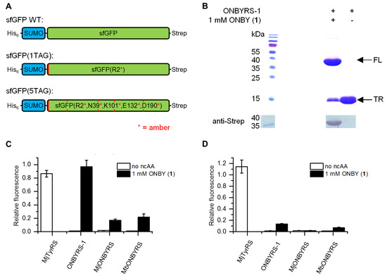 Characterization of ncAA incorporation by ONBYRS-1 into superfolder green fluorescent protein (sfGFP) reporter constructs and comparison with previously reported aaRSs (all expressed with corresponding tRNAs). (A) Schematic illustration of sfGFP reporter constructs for monitoring ncAA incorporation efficiency at one or five positions in sfGFP. Relative positions of the in-frame amber stop codons are indicated (red lines, the sfGFP WT control construct is free of these). (B) SDS-PAGE and anti-Strep Western blot analysis of sfGFP(1TAG) expression. Proteins were produced in E. coli BL21(DE3) using ONBYRS-1 in the presence or absence of 1 mM ONBY as indicated (FL = full-length, TR= truncated product). (C) Fluorescence reporter measurements for the incorporation of ONBY into sfGFP(1TAG) using E. coli BL21(DE3) cells. (D) Fluorescence reporter measurements for the incorporation of ONBY into of sfGFP(5TAG) using E. coli C321.ΔA.exp(DE3) cells. (C,D) Fluorescence values are normalized to strain-specific sfGFP WT fluorescence and to the OD600 of the bacterial culture. In case of ncAA supplementation, 1 mM ONBY was used. Data represent mean ± s.d. of biological triplicates.