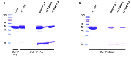 Thus far, two different aaRS variants for ONBY, based on either MjTyrRS or MbPylRS, respectively, have been reported (MjONBYRS and MbONBYRS) [23,25]. As both enzymes were evolved via conventional SSM, they can serve as a benchmark for our computational approach of ONBYRS-1 generation. We created the corresponding OTSs in a common genetic setup. As above, intact cell fluorescence and expression yields of the sfGFP amber suppression reporter constructs were determined. In comparison to ONBYRS-1, incorporation of ONBY into SUMO-sfGFP(1TAG) showed an approximately 6-fold or 4.5-fold decreased in-cell fluorescence when using MjONBYRS or MbONBYRS, respectively (Figure 2C). No significant fluorescence was observed for the incorporation of ONBY into sfGFP(5TAG) constructs using MjONBYRS, while fluorescence in the presence of MbONBYRS was about 2-fold lower than for ONBYRS-1 (Figure 2D). These data are consistent with the observed sfGFP expression yields (Figure 3, Table 2). To rule out that the observed higher stop codon suppression activity is caused by different expression levels of the aaRS variants in vivo, both MjTyrRS-based enzymes, ONBYRS-1 and MjONBYRS, were expressed and purified. Since this resulted in similar aaRS yields of 18 mg and 12 mg per liter of culture, it indicates that the markedly higher ONBY incorporation and target protein production efficiencies using ONBYRS-1 result from superior enzymatic activity. In summary, the presented data demonstrate that the evolved ONBYRS-1 enzyme is substantially more efficient than the existing aaRSs and suggest that our computational approach to aaRS engineering can outperform classical SSM approaches.