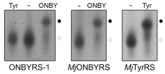 ONBY serves as a substrate of ONBYRS-1 and MjONBYRS. Representative in vitro aminoacylation of MjtRNACUA by ONBYRS-1 (44 ± 8%, n = 6, left panel) and MjONBYRS (42 ± 9%, n = 10, middle panel) with ONBY, as well as by MjTyrRS with Tyr (48 ± 12%, n = 15, right panel) analyzed by gel electrophoresis. In vitro transcribed, uncharged tRNA served as a control (-). ONBYRS-1 does not aminoacylate tRNACUA with tyrosine (Tyr, left panel). Aminoacyl-tRNAs (●) were detected by their slower migration compared to uncharged tRNA (○) in 6.5% acidic denaturing PAGE. tRNAs were visualized by SYBR gold staining.