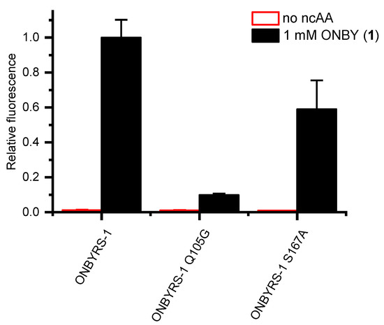 This hypothesis was tested by reverting the two key mutations G105Q and A167S. The resulting ONBYRS-1 variants were then tested for in vivo stop codon suppression efficiency. Indeed, these two aaRS mutants revealed a drop in cellular sfGFP reporter fluorescence by ∼90% or 41%, respectively (Figure 6). This indicates that the interactions suggested by the model are indeed required for high ONBYRS-1 activity towards the ncAA substrate and for amber suppression efficiency attained in vivo.