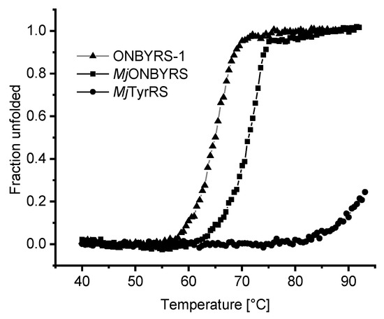 Given that ONBYRS-1 contains ten mutations relative to the wild type enzyme, the impact of mutations on the thermal stability of the aaRS enzyme was investigated (Figure 7). As evident from thermal melting profiles, the stability of the protein scaffold is decreased by mutations altering the substrate specificity towards ONBY. Both MjTyrRS-derived mutant proteins display a markedly decreased stability relative to the high melting point of the wild type enzyme. The latter is remarkably robust, as it could not be thermally unfolded to full extent within the used experimental setup.