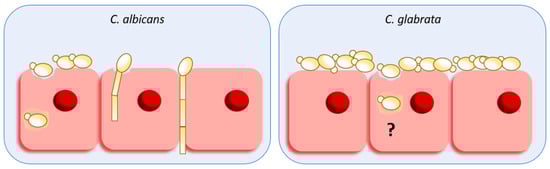 Co-infection with other microorganisms may be a possible explanation to the invasive capacity of C. glabrata since this yeast is often co-isolated in infections with C. albicans [59,60,61] or even other pathogens such as Clostridium difficile [62]. In the co-infected environment, C. glabrata cells may exploit the tissue invasion and destruction caused by C. albicans to access nutrients and reach the bloodstream. In fact, Tati et al. (2016) [63] demonstrated that when mice are infected with C. glabrata alone, oropharyngeal candidiasis is negligible, however, when co-infected with C. albicans, an increased colonization by C. glabrata was observed. This effect was attributed to the binding of C. glabrata to C. albicans hyphae [63] and similar results were reported by Alves et al. (2014) [64] using a reconstituted human vaginal epithelium. Nonetheless, the intracytoplasmic presence of C. glabrata was detected in oral epithelial cells [65] and vaginal epithelial cells [66] and it has been shown that when endocytosis is inhibited, the internalization of C. glabrata is prevented [65]. This suggests that induced endocytosis by host cells could be the most likely mechanism of C. glabrata internalization (Figure 1).