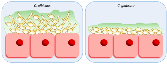 A very clear difference between C. albicans and C. glabrata mature biofilms is the dimension and total biomass of each biofilm. C. glabrata in vivo biofilm formation leads to a thickness of 75–90 ± 5 µm, which is half of the normal thickness of C. albicans biofilms [130], with much less biomass in the end of biofilm formation compared to C. albicans [131]. The organization of the biofilm structure also differs between these two species. C. albicans biofilms are arranged in a three-dimensional structure with different morphologies and empty spaces between cells [132], where microchannels are formed [133]. On the other hand, C. glabrata biofilms are thinner, but display a higher density of cells, tightly packed together [132]. Although C. glabrata’s biofilms are composed by yeast cells only [131,132], the same is not true for C. albicans biofilms, where different morphologies arise. C. albicans mature biofilms are composed by a dense network of pseudohyphae, hyphae, and yeast cells [134]. This filamentation process in biofilm formation is controlled by the transcription factor Efg1, without which C. albicans only forms scarce monolayers of elongated yeast cells on polyurethane catheters and polystyrene [135,136].