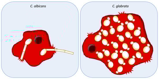 Overall, the two more prevalent pathogenic yeasts, C. albicans and C. glabrata, follow two main different strategies to achieve the same ultimate goal: survive host immune response. On one hand, C. albicans hyphal forms actively pierce the membrane of macrophages as a mechanism of killing and escape. On the other hand, C. glabrata, that lacks morphological plasticity, survives and replicates within macrophages due to its remarkable ability to surpass its harsh environment, ultimately leading to macrophage lysis after several days due to fungal cells overload [21] (Figure 3).