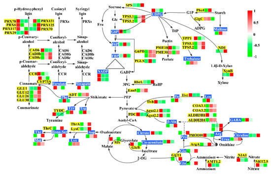 - Wolf-Rüdiger, S.; Mark, S. Genome-wide reprogramming of primary and secondary metabolism, protein synthesis, cellular growth processes, and the regulatory infrastructure of Arabidopsis in response to nitrogen. Plant Physiol. 2004, 136, 2483–2499. [Google Scholar]