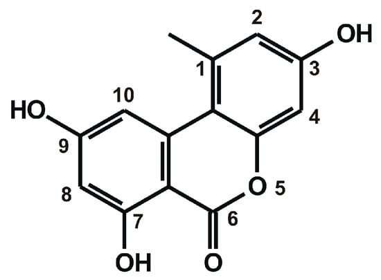 Mycotoxins are secondary metabolites of filamentous fungi, exerting adverse effects in humans and animals [1,2]. Alternaria species contaminate unprocessed food (e.g., cereal crops, grape, tomato, oilseeds, and citrus fruits) [3,4,5] and processed products (e.g., apple juice, wine, and tomato paste) [6,7,8]. Alternaria molds are responsible for the post-harvest decay of agricultural products, even during refrigerated transport and storage, due to their ability to grow even at low temperature [9]. Alternariol (AOH; Figure 1) is a dibenzo-α-pyrone mycotoxin produced by Alternaria species, it shows structural similarity with known xenoestrogens such as urolithins and genistein [10]. The acute toxicity of AOH is considered to be low [11], and its chronic in vivo toxicity is also controversial. Increased incidence of esophageal cancer has been reported in some areas with higher AOH exposure [12,13]. Genotoxic, mutagenic, and endocrine disruptor effects of AOH have also been described in several in vitro studies. AOH inhibits the catalytic activity of topoisomerase I and II enzymes [5,14,15]. Furthermore, Tiessen et al. [16] demonstrated that AOH (as a pro-oxidant) can change the cellular redox status, however, no oxidative stress-related DNA damage was observed in cell culture. AOH has weak estrogenic and androgenic/antiandrogenic effects, however, the dietary exposure results in its relatively low plasma concentrations (5–10 nM) which makes questionable the in vivo relevance of the endocrine disruptor effects of AOH [10,11,17,18].