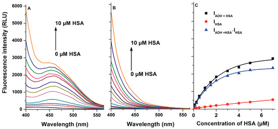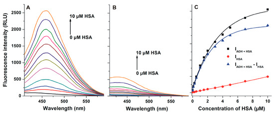 First, the fluorescence excitation and emission spectra of AOH were recorded in PBS (pH 7.4). AOH exerts fluorescence under physiological conditions (Figure 2), its excitation wavelength maximum was noticed at 345 nm (λem = 421 nm), while its emission maximum appeared at 421 nm (λex = 345 nm). In the presence of HSA, a red shift (421 → 455 nm) of the fluorescence emission spectrum was noticed, and the fluorescence signal of AOH was markedly increased (Figure 3A). Under the applied circumstances, the HSA preparation (without AOH) also showed fluorescence at 455 nm (Figure 3B); however, the HSA-induced increase in the fluorescence of AOH was considerably higher than additive (IAOH + IHSA) (Figure 3C).