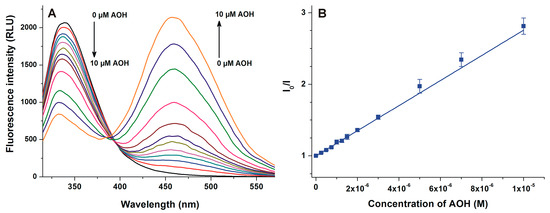 (A) Fluorescence quenching of HSA by AOH. Fluorescence emission spectrum of HSA (2 μM) in the presence of increasing concentrations of AOH (0.0, 0.25, 0.5, 0.75, 1.0, 1.25, 1.5, 2.0, 3.0, 5.0, 7.0, and 10.0 μM) in PBS (pH 7.4; λex = 295 nm); (B) Stern-Volmer plot of AOH-HSA interaction (λex = 295 nm, λem = 340 nm).
