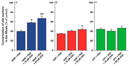 Displacement of Sudlow’s site I (SSI) (WAR, warfarin), Sudlow’s site II (SSII) (NAP, naproxen), and Heme site (CPT, S-camptothecin) ligands from HSA by AOH. Concentrations of warfarin (A), naproxen (B) and S-camptothecin (C) in the filtrates (% of control): Before the ultrafiltration, samples contained WAR and HSA (1.0 and 5.0 μM, respectively), NAP and HSA (1.0 and 1.5 μM, respectively), or CPT and HSA (1.0 and 1.5 μM, respectively) with or without 10 or 20 μM AOH in PBS (pH 7.4; * p < 0.05, ** p < 0.01). In each model, the filtered concentration of site markers was compared to the concentration measured in the filtrate when no HSA was added to the sample (100%).