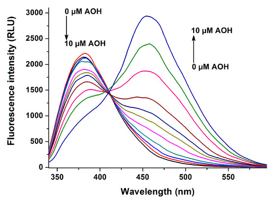 Fluorescence emission spectrum of warfarin (1.0 μM) in the presence of HSA (3.5 μM) and increasing concentrations of AOH (0.0, 0.1, 0.25, 0.5, 1.0, 1.5, 2.0, 3.0, 5.0, 7.0, and 10.0 μM) in PBS (pH 7.4; λex = 317 nm).