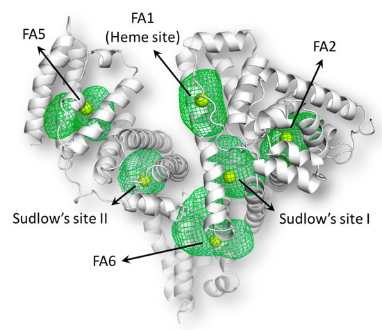 The independent docking simulations were performed in each site (Figure 9) to identify the binding site(s) involved in AOH-HSA interaction. After the collection of docking poses, a rescoring procedure using the HINT (Hydropathic INTeractions) scoring function was carried out. The reliability of this method was previously demonstrated as it succeeded to predict protein-ligand (including HSA-ligand) complex formation [32,33]. According to the rescoring procedure, AOH is possibly able to dock into FA1 (Heme site), SSI, and FA6 positions (Table 2).