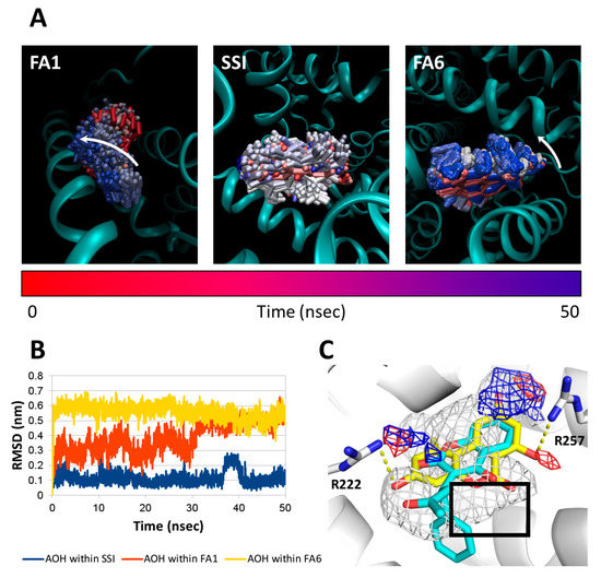 Results of molecular dynamic (MD) simulations and docking studies. (A) Time-step representation of the AOH trajectories within FA1 (Heme site), SSI, or FA6 sites. The from-red-to-blue color switch indicates the stepwise changes of AOH coordinates along the MD simulation. The trajectory outward the binding site within FA1 and FA6 is indicated by the white arrow; (B) root-mean-square analysis (RMSD) plot of AOH within FA1, SSI, or FA6 sites; (C) Calculated binding architecture of AOH (represented in yellow sticks) in comparison to the crystallographic pose of R-(+)-warfarin (represented by cyan sticks) (PDB (Protein Data Bank) code 1H9Z) [35]. The residues involved in polar interactions with AOH are represented by white sticks, while polar contacts are represented by yellow dotted lines. White, red, and blue meshes indicate regions sterically and energetically favorable to receive hydrophobic, hydrogen bond acceptor, and hydrogen bond donor groups, respectively. The black box indicates the pharmacophoric mismatch caused by the placing of the polar α-benzopyrone moiety of AOH within the hydrophobic space of the pocket.
