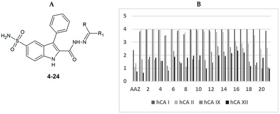 The 2-(hydrazinocarbonyl)-3-phenyl-1H-indole-5-sulfonamide was previously tested by members of our group against the tumor-associated hCA IX and XII and the off-targets, hCA I and II [20]. Compared to this previous compound, the newly synthesized hydrazon compounds had higher selectivity for hCA IX/XII compared to the off-targets.