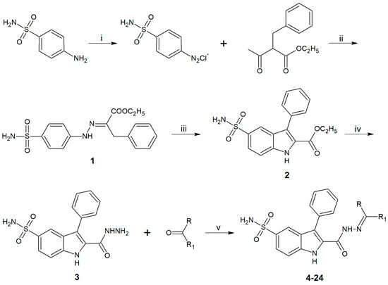 As was previously reported by our group, 3-phenyl-5-sulfonamido-1H-indole-2-carbohydrazide 1 was prepared from sulfanilamide as outlined in Scheme 1. After diazotization of the sulfanilamide, condensation of diazonium salt with ethyl 2-benzylacetoacetate 2 led to an intermediate, which was cyclized in acidic medium with formation of the ethyl ester derivative of 3, which was converted to 3 by treatment with hydrazine [20]. Further treatment of 3 with an appropriate carbonyl compound (ketone or aldehyde) yielded hydrazone derivatives 4-24 (Scheme 1).