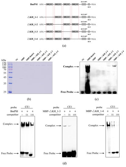 Structure and binding ability of BmPSI and truncation proteins: (a) Comparison among BmPSI and four truncation proteins used for the binding experiment. “DUF” means “domain of unknown function”. (b) The dosage of these proteins. “NC” means “negative control”. (c) Binding ability of these proteins with CE1. Buffer and maltose binding protein (MBP) were set as the negative control and wild-type BmPSI was used as the positive control. (d) Cold competition electrophoretic mobility shift assay (EMSA) experiment between CE1 and BmPSI, MBP-ΔKH_1-3, and MBP-ΔKH_1-4 proteins.