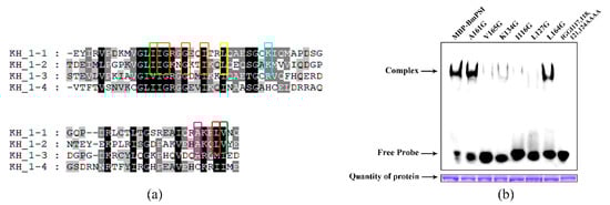 Important amino acids in the KH_1-1 motif of BmPSI: (a) Comparison among amino acid sequences of the KH_1 motifs in BmPSI. The black color represents that amino acids are completely identical. The gray color represents that partial amino acids are identical. Different colored boxes represent different potential key amino acid sites for the binding. (b) After the concentrations were adjusted uniformly, EMSA was performed on wild-type BmPSI and seven amino acid mutants of BmPSI.