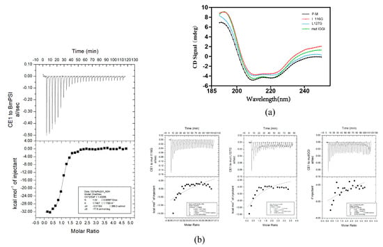 To determine whether these three amino acid mutant proteins transform the secondary structure of BmPSI, circular dichroism (CD) spectroscopy was performed on the wild-type BmPSI and these three mutant proteins (Figure 3a). The results suggest that the three mutant proteins and the wild-type BmPSI have similar patterns. There are two minima at 208 and 222 nm in the result, which is considered to be the norm for α-helices []. This suggests that these amino acid mutations did not influence the interaction process by altering the secondary structure of BmPSI. To verify that these three amino acid mutants did lose their ability to bind CE1, isothermal titration calorimetry (ITC) was performed (Figure 3b) [,]. Firstly, the wild-type BmPSI was analyzed to explore the appropriate conditions for the experiment. Then, the detailed energetic profile of the interaction between BmPSI and CE1 was obtained (Table 1). The average K value of 1.74 × 107 (n =1.02) of the CE1/BmPSI system indicates that there is a strong interaction between BmPSI and CE1.