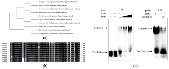 The combination of PSI and CE1 is conserved in Spodoptera litura: (a) A phylogenic tree based on the PSI of 10 species. (b) Conservation analysis of KH_1 motifs in these 10 species. The black color represents that amino acids are completely identical. The gray color represents that partial amino acids are identical. (c) SlPSI concentration gradient EMSA and cold competition EMSA.