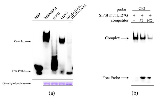 EMSA of wild-type SlPSI and three kinds of potentially key amino acid mutant SlPSI proteins. (a) MBP-BmPSI was set as the positive control. The signal intensity of the complex stood for the abilities of different proteins to interact with the CE1 probe. (b) Cold competition EMSA experiment between CE1 and SlPSI mutL127G.
