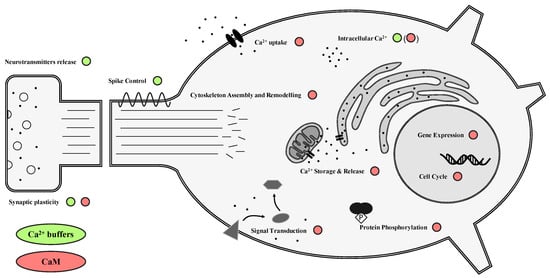 Calcium (Ca2+) has long been recognized as an indispensable ion in neurons, as it is involved in functions as diverse as membrane excitability, signal transduction, neurotransmitters release, synaptic plasticity, cell cycle regulation, cell migration, and axon growing [,,,]. A highly conserved signaling toolkit controls the level of intracellular Ca2+: Ca2+ ions enter the cytoplasm through channels on the plasma membrane, or can be released from intracellular stores in the endoplasmic reticulum, Golgi apparatus, and mitochondria; then, through the activity of pumps and ion exchangers, the Ca2+ concentration can return to lower steady-state levels [,,]. These mechanisms allow the formation of Ca2+ transients during which Ca2+ can act directly or indirectly on several pathways by binding to calcium-binding proteins (CBPs), which interpret and respond to the transients [,].
