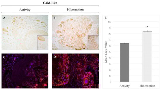 To test whether the increased CaM-like positivity is specific to the cerebral ganglion, here we have further compared CaM-like immunoreactivity in the suboesophageal ganglion of active and hibernating C. aspersum combining chromogenic and fluorescent immunohistochemistry (Figure 2). While only few cells showed positivity for this marker in the cytoplasm in awake snails (Figure 2A, insert), most neurons were strongly immunoreactive during hibernation (Figure 2B,D). By quantifying immunofluorescence intensity using the ImageJ particle analysis tool (ImageJ 1.51 s; NIH, Bethesda, MA, USA) as described previously [], we showed that the observed changes between activity and hibernation are highly significant (Figure 2E), indicating that CaM plays a key role in neuron survival in the entire nervous system by buffering Ca2+ concentration or by binding to other effector proteins.