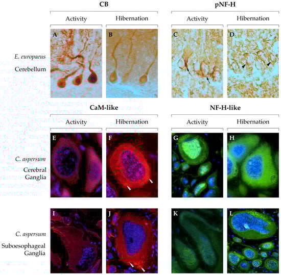 Comparison of immunohistochemistry staining for CBPs and NF-H between activity and hibernation in vertebrate (European hedgehog, A–D) and invertebrate (garden snail, E–L) models. In the cerebellum of active hedgehogs, the cytoplasm and dendritic tree of Purkinje neurons showed strong CB labeling (A), while a visible decrease was detected after a long period of hibernation (B). NF-H immunopositivity was present in axons and terminals around Purkinje cells somata during activity (C, arrows), and strongly decreased after a long period of hibernation, when it was observed only in few terminals (D, arrowheads). In the cerebral (E–H) and suboesophageal (I–L) ganglia of the garden snail, a significant increase in the number of positive neurons and intensity of immunoreactivity for CaM-like during hibernation (F,J) was accompanied by an increased recognition of epitopes by anti-NF-H antibodies (H,L) with respect to activity (E, I and G, K, respectively). Throughout the snail CNS, several neurons showed hibernation-specific aggregates of CaM-like in the cytoplasm (F, J, double arrowheads). Experiments were carried out as described in [,]. Magnification: 40× (A–D, I–L); 60× (G); 100×(E,F,H).