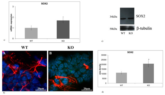 Reduction in fetal mesencephalic dopamine progenitor SOX2-positive cells induced by vitamin D has been reported in a mouse model of prenatal immune activation [20]. Vitamin D accelerated differentiation towards DA neurons suggesting that it could be a hallmark of the brain protection from damage. Thus, we hypothesized that opposite changes in SOX2-positive cells might occur in hippocampus of NPA mouse model (aSMase-KO mice). To test this hypothesis, SOX2 gene and protein expression was analyzed in the hippocampus of wild type (WT) and aSMase-KO mice. We showed that SOX2 gene expression was significantly upregulated in KO mice (Figure 1a). Likewise, the SOX2 protein resulted overexpressed in absence of aSMase (Figure 1c,d). We compared the expression and distribution of SOX2 (marker of staminal cells), GFAP (marker of mature astrocytes). Sections of hippocampal tissues were stained with SOX2 (green) and GFAP (red) specific antibodies and counterstained with DAPI (blue) to examine the GD, a region of the adult brain where neurogenesis takes place. Immunofluorescence staining revealed that aSMase-KO mice displayed an increase in SOX2 expression in the GD. compared with WT mice (Figure 1b). To confirm the increase of SOX2 protein, immunoblotting analysis was performed (Figure 1c). Densitometric analysis of immunoblotting bands showed 1.43-fold increase in SOX2 levels in the hippocampus of aSMase-KO genotype (Figure 1d).