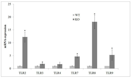 aSMase deficiency results in upregulation of TLR mRNA. Quantification of TLR2, 3, 4, 7, 8 and 9 mRNA by RT-qPCR performed in hippocampus from WT and aSMase-KO mice. Relative mRNA levels are expressed as fold changes using cDNA of WT as calibrator. GAPDH was used as housekeeping gene. Values represent the mean ± SD of three independent experiments performed in triplicate. * p < 0.05 vs. WT mice. WT, wild type; KO, aSMase-KO; TLR, toll-like receptor.