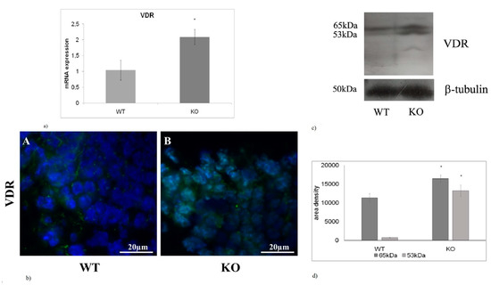 In this study the expression of VDR was also analyzed. The results showed that aSMase-KO mice exhibit a 2-fold increase in VDR mRNA expression levels compared with WT littermates (Figure 4a). Moreover, immunofluorescence images highlighted a specific nuclear localization of VDR (Figure 4b). Immunoblotting analysis revealed that the expression of both 53- and 65kDa VDR isoforms was higher in aSMase-KO mice than in WT mice (Figure 4c). However, a greater increase (19-fold) in favor of the 53 kDa isoform was observed (Figure 4d).