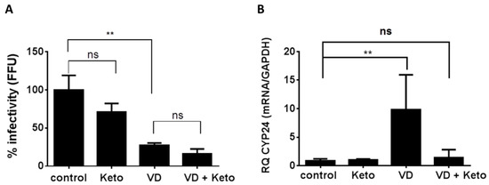 Effect of ketoconazole on the anti-hepatitis C virus (HCV) activity of vitamin D3. Huh7.5 cells were treated with vitamin D3 (VD) (5 µM), ketoconazole (Keto) (1 µM), or both 3 h prior to infection. Nonsignificant is denoted by ns. (A) Inhibition of HCV HJ3-5 virus production, as determined by focus-forming unit (FFU) assay of virus released into cell culture media 24 h post-infection. (B) Real-time polymerase chain reaction (PCR) analysis of Cyp24A1 expression level in Huh7.5 treated cells. A representative of two experiments was performed in triplicates. The results are shown as the relative quantity (RQ) normalized to Gapdh mRNA values; the control cells were assigned a value of 1. Statistical significance was calculated by two-tailed Student’s t test ** p < 0.002, ns—nonsignificant.