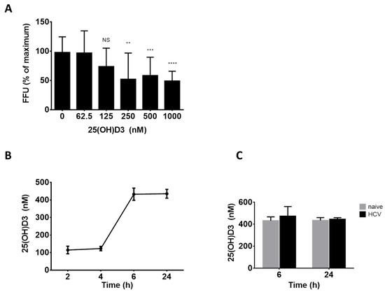 Involvement of 25(OH)D3 in mediating vitamin D3 anti-HCV effect. (A) Inhibition of HCV HJ3-5 virus production as determined by FFU assay of virus released into media following infection and treatment with 25(OH)D3 (62.5–1000 nM). Percent of FFU was calculated by comparing with virus released in nontreated cell cultures (0). Mean values ± SD of three different experiments are presented. Statistical significance was calculated by two-tailed Student’s t test and is indicated as follows: ** p < 0.05, *** p < 0.01, **** p < 0.0001; ns—nonsignificant. (B) ELISA analysis of 25(OH)D3 levels produced by noninfected Huh7.5 cells 2–24 h post-treatment with vitamin D (5 μM) and (C) HCV infected and noninfected cells 6 and 24 h post-treatment with vitamin D (5 μM). A representative experiment out of two was performed in triplicates.