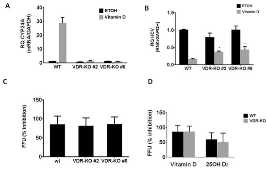 Documented direct effects of 25(OH)D3 are generally attributed to its VDR-agonistic action. To ascertain that the anti-HCV activity of 25(OH)D3 in this study is VDR mediated, its inhibitory effect was examined in VDR-KO cells. We found that knocking out the VDR did not affect the antiviral activity of 25(OH)D3 and also of vitamin D3 while preventing the induction of Cyp24A1 by vitamin D3. These results indicate that the anti-HCV effects of 25(OH)D3 and vitamin D3 are exerted by a VDR-independent mode of action.
