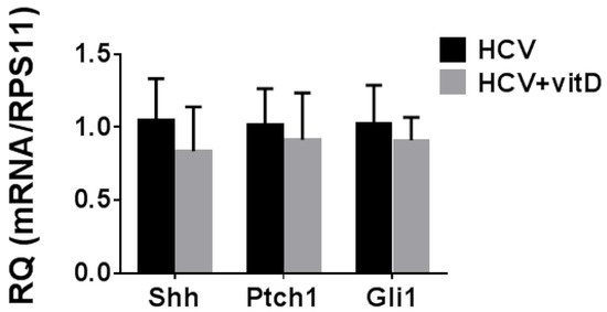 The finding of a VDR-independent mode of action of vitamin D3 raised the possibility that the anti-HCV effect is mediated by a direct action of the vitamin. The only direct biological activity reported to date for cholecalciferol is its inhibitory effect on the Hh pathway [9]. An association between HCV replication and Hh pathway activity was reported [19], suggesting that inhibition of the Hh pathway would inhibit HCV replication. The Hh pathway is frequently activated in HCCs and the expression of Hh target genes serves as an indication for pathway activation [20]. Therefore, we measured mRNA levels of the Hh pathway genes and downstream targets Shh, Ptch1, and Gli1 in the VDR-KO Huh7.5 cells. We found that the Hh pathway is active in the wild-type (WT) cells (data not shown) as well as in the VDR-KO Huh7.5 cells (Figure 4) in accordance with previous reports [19]. However, as shown in Figure 4, there was no effect of vitamin D3 on mRNA expression of these genes in these cells, implying that its antiviral effect in our experimental system is probably not mediated through the Hh pathway.