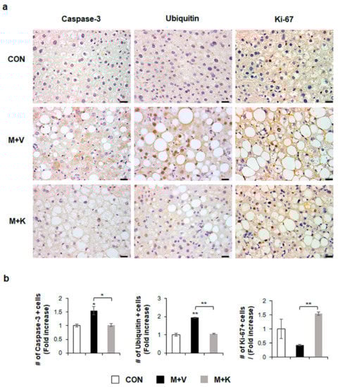 - Guy, C.D.; Suzuki, A.; Burchette, J.L.; Brunt, E.M.; Abdelmalek, M.F.; Cardona, D.; McCall, S.J.; Unalp, A.; Belt, P.; Ferrell, L.D.; et al. Costaining for keratins 8/18 plus ubiquitin improves detection of hepatocyte injury in nonalcoholic fatty liver disease. Hum. Pathol. 2012, 43, 790–800. [Google Scholar]
