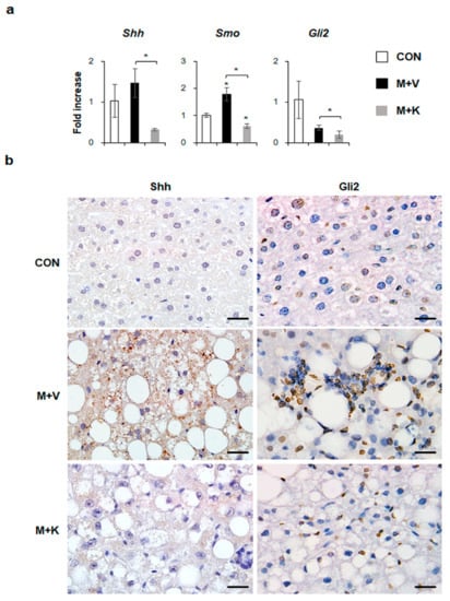 - Guy, C.D.; Suzuki, A.; Zdanowicz, M.; Abdelmalek, M.F.; Burchette, J.; Unalp, A.; Diehl, A.M. Hedgehog pathway activation parallels histologic severity of injury and fibrosis in human nonalcoholic fatty liver disease. Hepatology 2012, 55, 1711–1721. [Google Scholar]