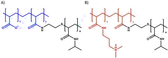 Molecular structure of (A) poly(acrylic acid) grafted with poly(N-isopropylacrylamide) (PAA-g-PNIPAM) and (B) poly(N,N-dimethylaminopropyl acrylamide) grafted with poly(N-isopropylacrylamide) (PDMAPAA-g-PNIPAM). The coloured parts represent the polyelectrolyte backbones while the black ones represent the PNIPAM units.
