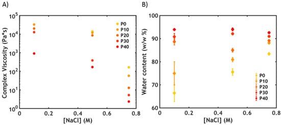 (A) Complex viscosity recorded at ω = 0.1 rad/s (P0S0.1 is missing since the measuring position in the rheometer could not be reached because of the high stiffness of the sample) and (B) water content at 20 °C as function of [NaCl] in PxSy. Error bars in (B) represent standard deviations.