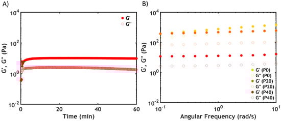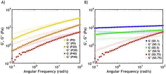 (A) Time sweeps performed on P40S0.75 and (B) frequency sweeps performed on samples PxS0.75 immediately after the salt-activation at 20 °C. Filled dots represent G’, while hollow dots represent G”.