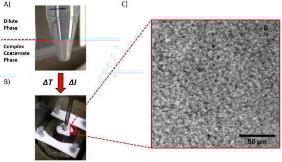 The complex coacervate phase, (A) liquid and transparent at low temperature and high ionic strength, turns into a white soft solid when exposed to either a temperature increase (ΔT) or (B) an ionic strength decrease (ΔI). (C) The solid material shows a porous structure due to the formation of water pockets.