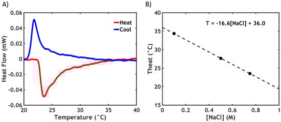 (A) Differential scanning calorimetry (DSC) thermogram for P40S0.75 and (B) Theat as a function of [NaCl] in P40Sy.